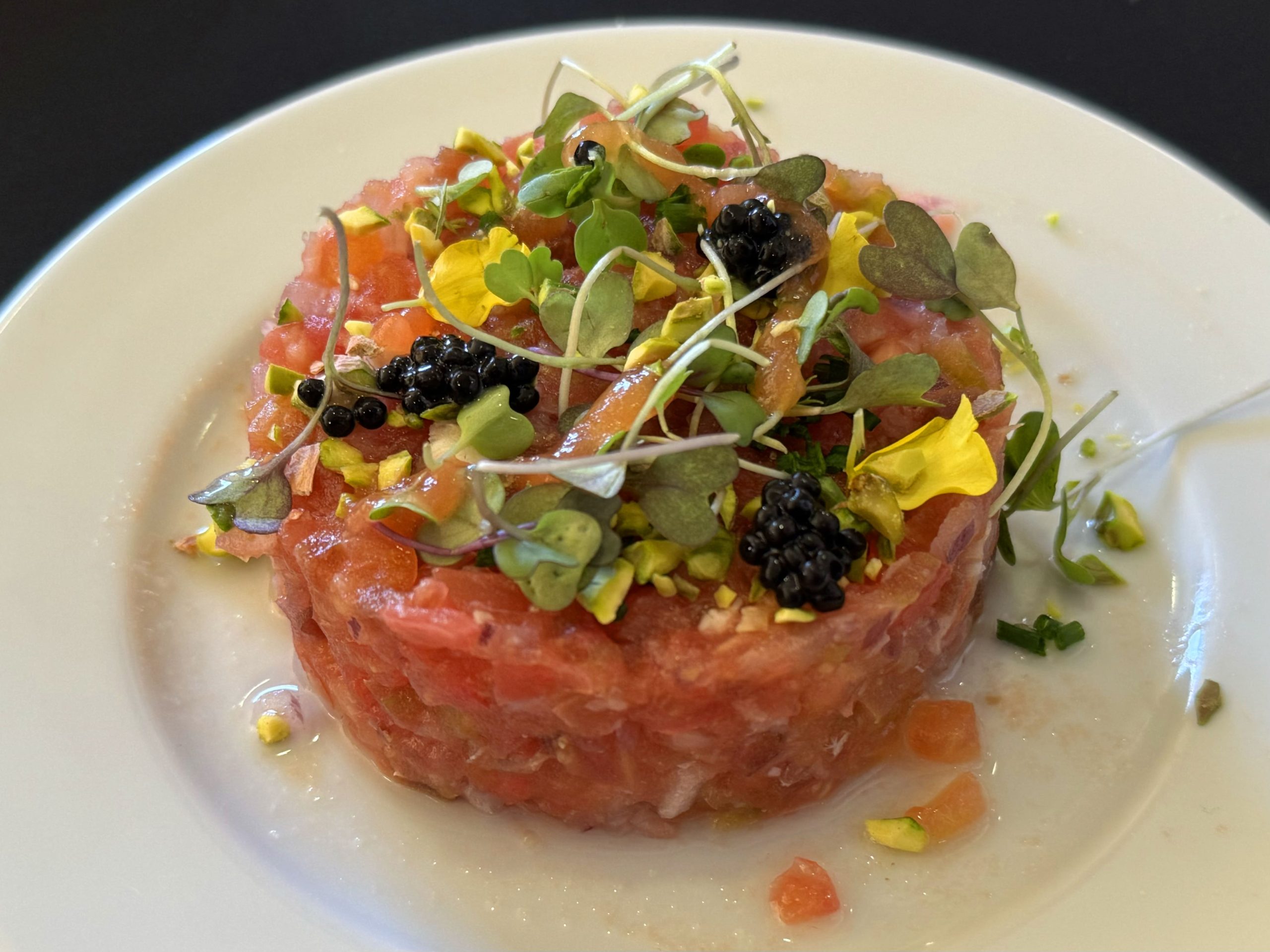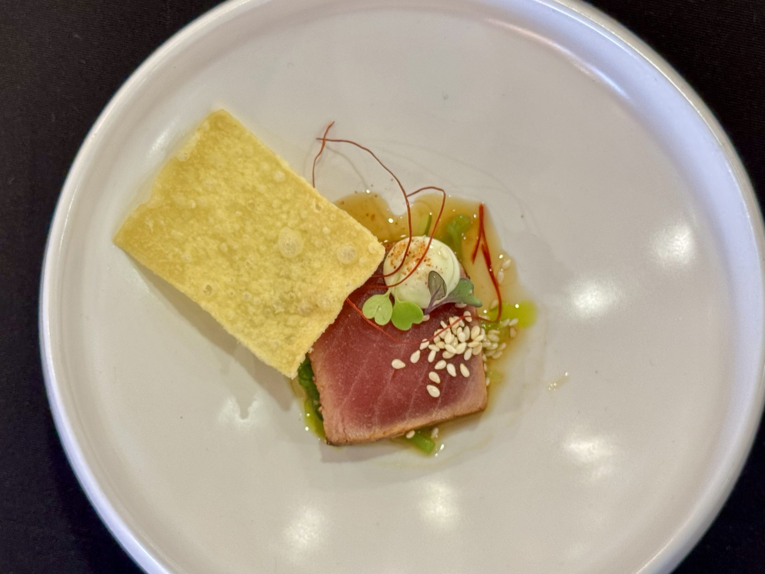 Atún de aleta amarilla sellado al fuego y recubierto de una mezcla de especias. Se sirve con mayonesa suave de wasabi y wakame.