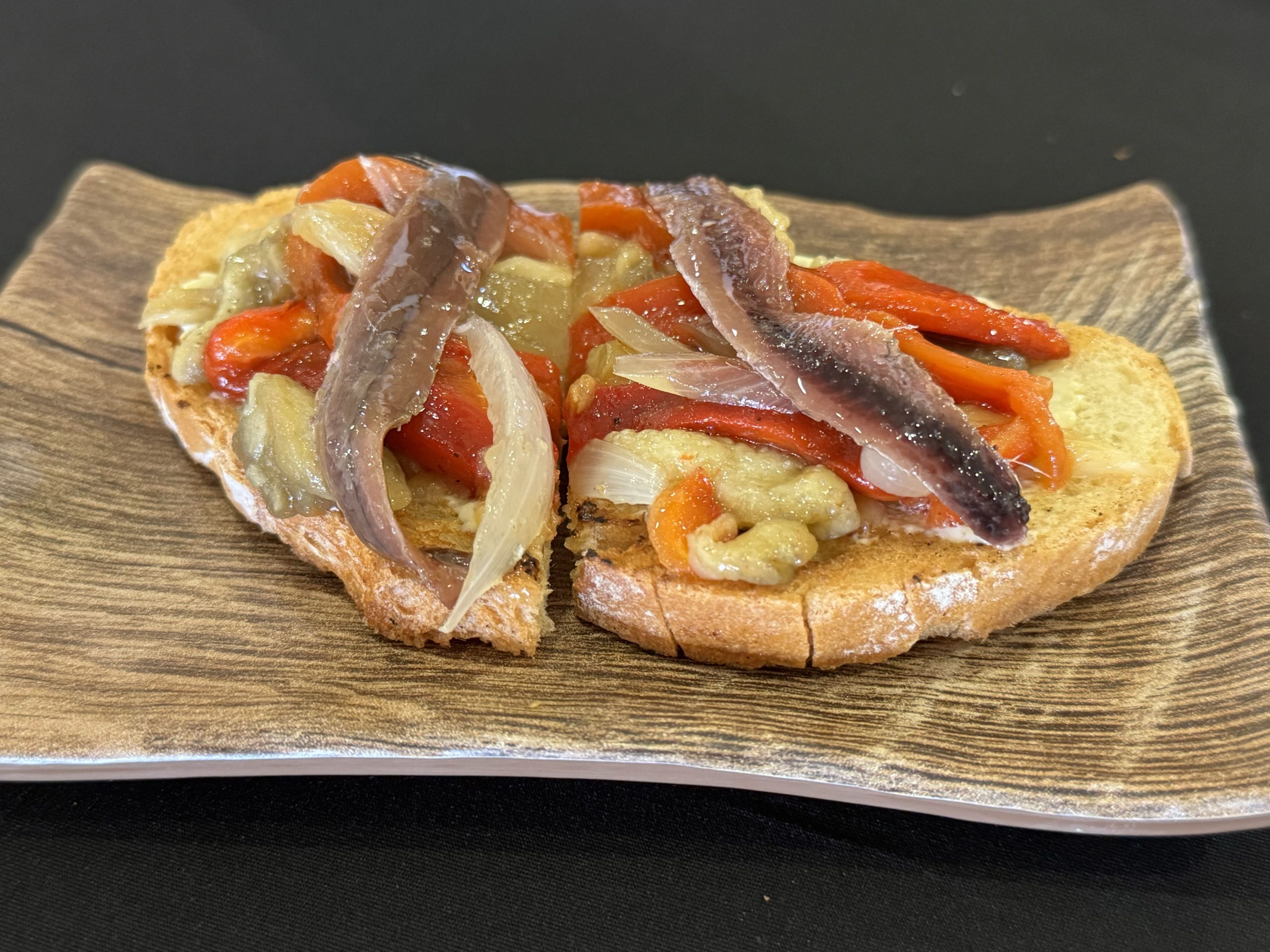 Pan de pueblo tostado al carbon, con base de ali oli, escalivada y anchoas de L’ Escala. Escalivada y ali oli elaboración propia.