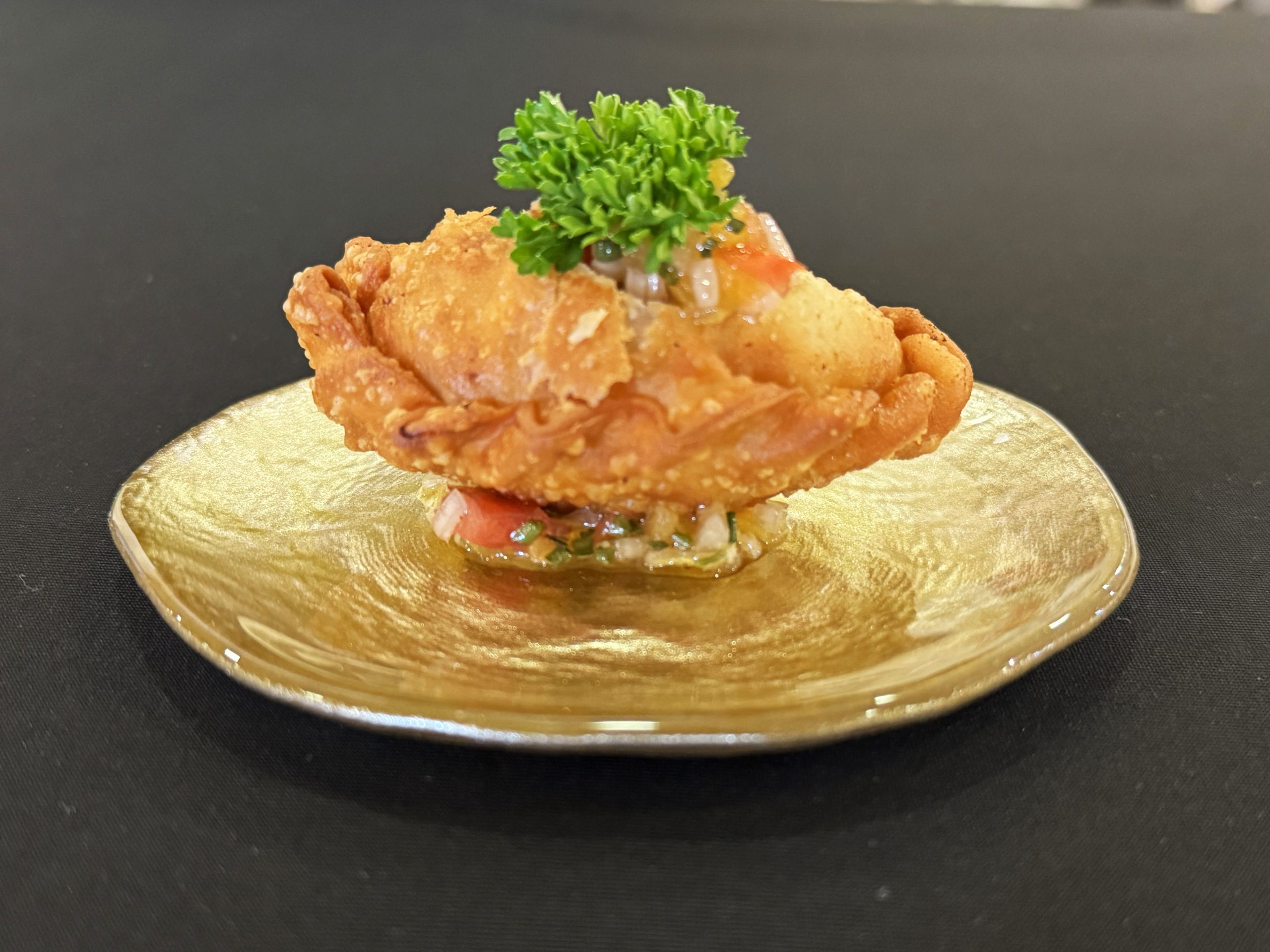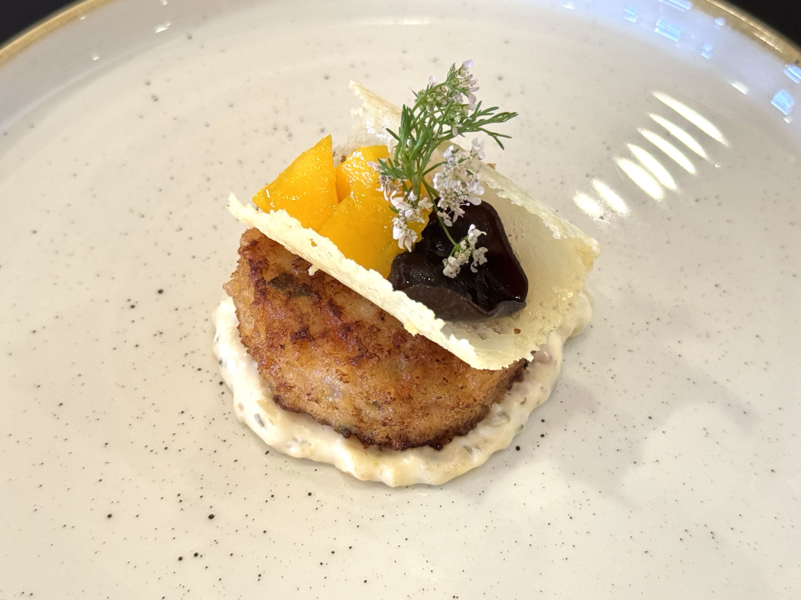 Tortita de gambas , bacalao y ajos tiernos, en crujientes de trigo, con base de salsa tártara, queso en concha,toque de seta,mango y inojo
