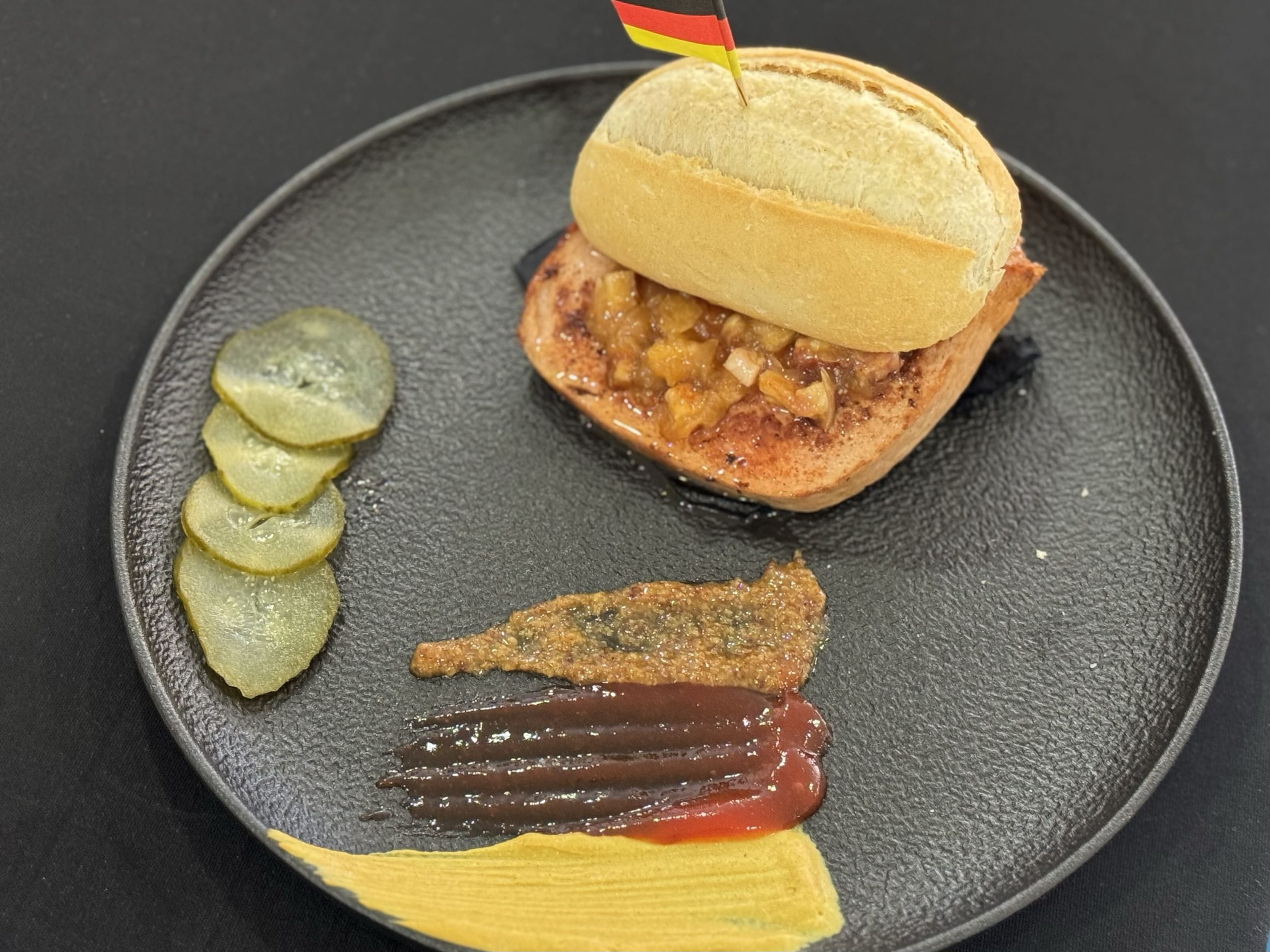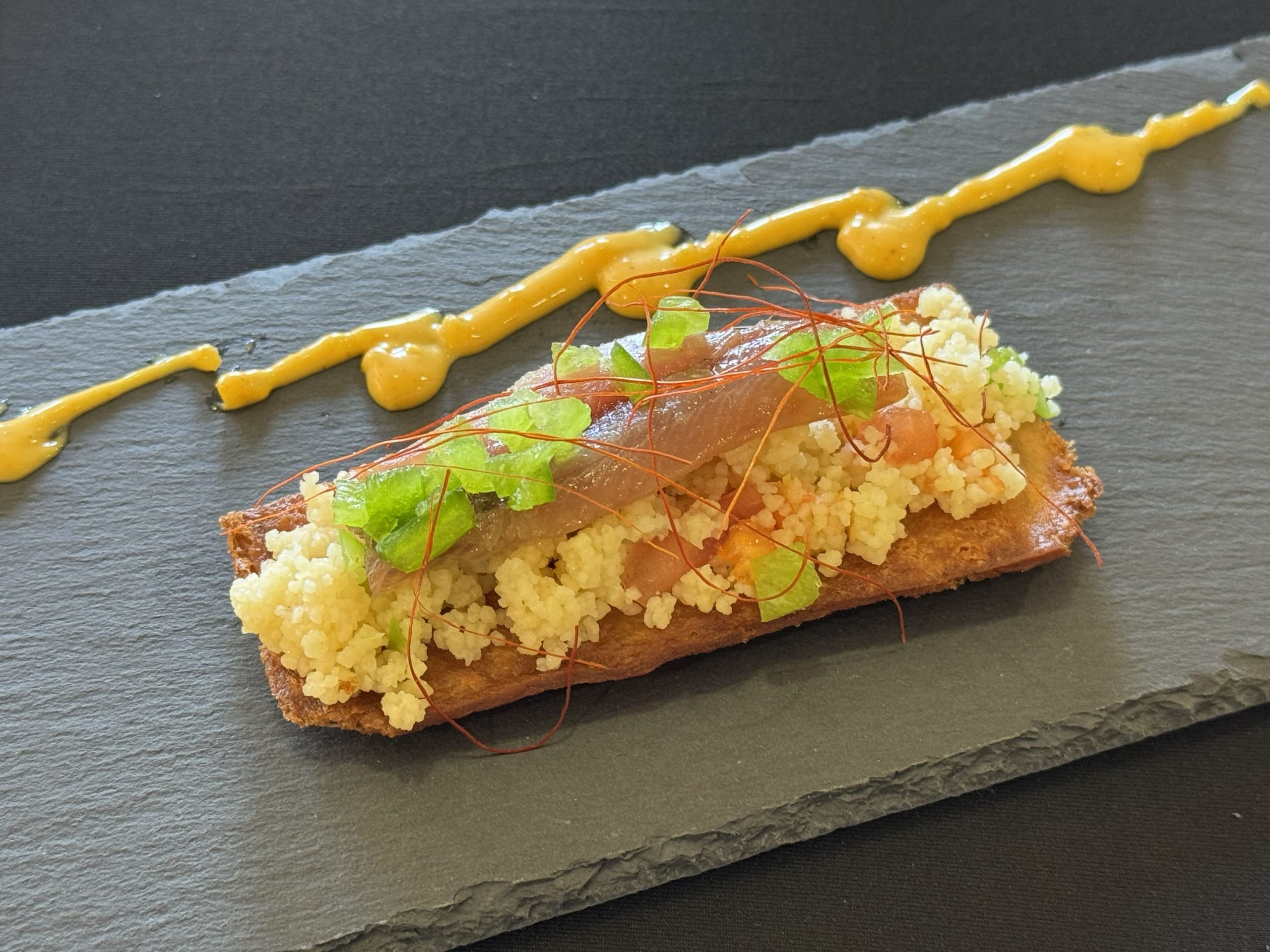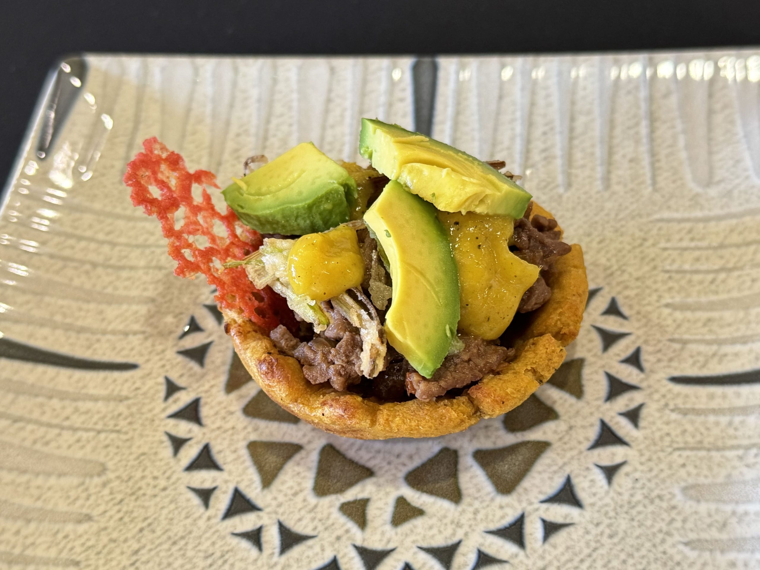 Base de plátano majado con salsa de cacahuete,relleno salsa de aguacate y ternera salteada coronado con crujiente de remolacha, puerros toques de salsa de mango.