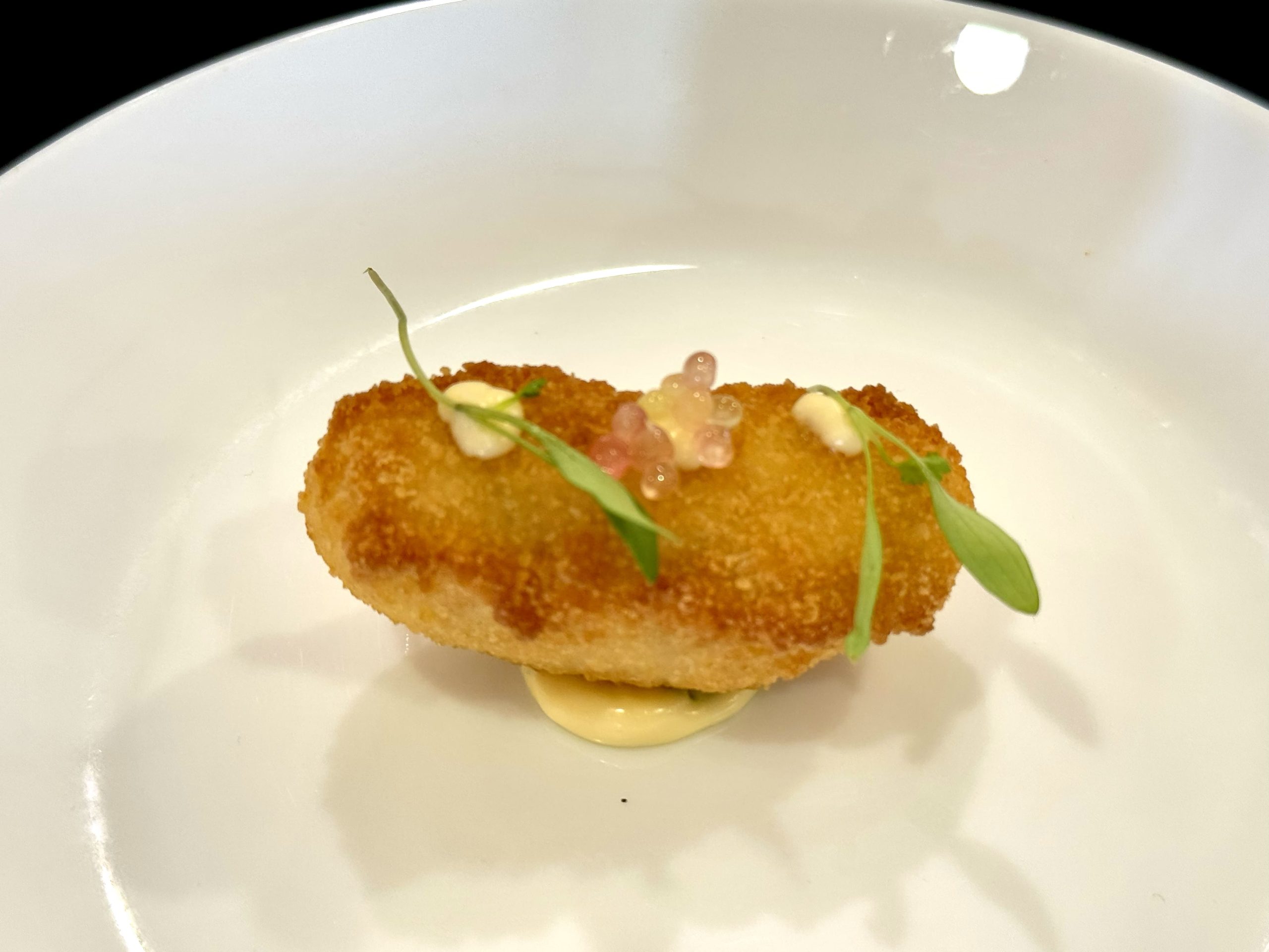 Croqueta de cocodrilo sobre Alí Oli de lima y caviar cítrico