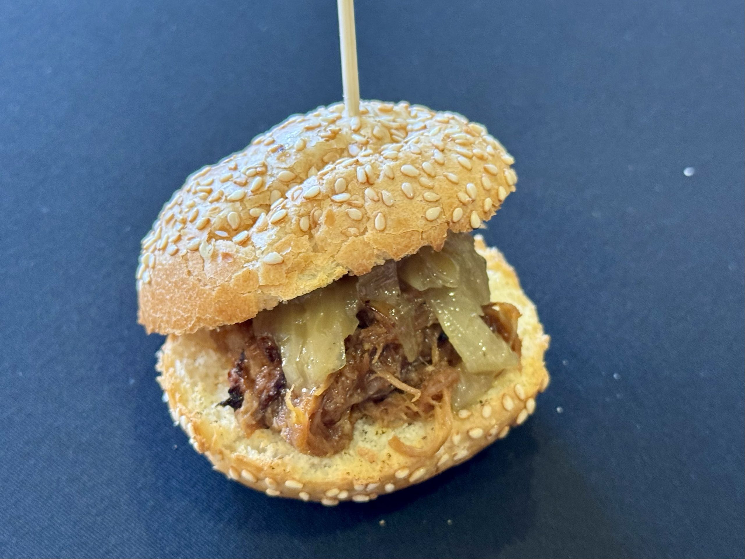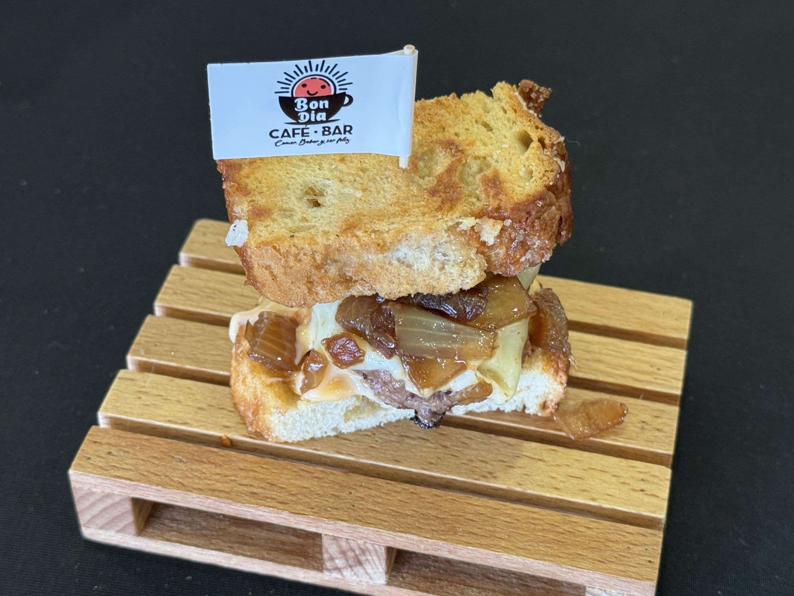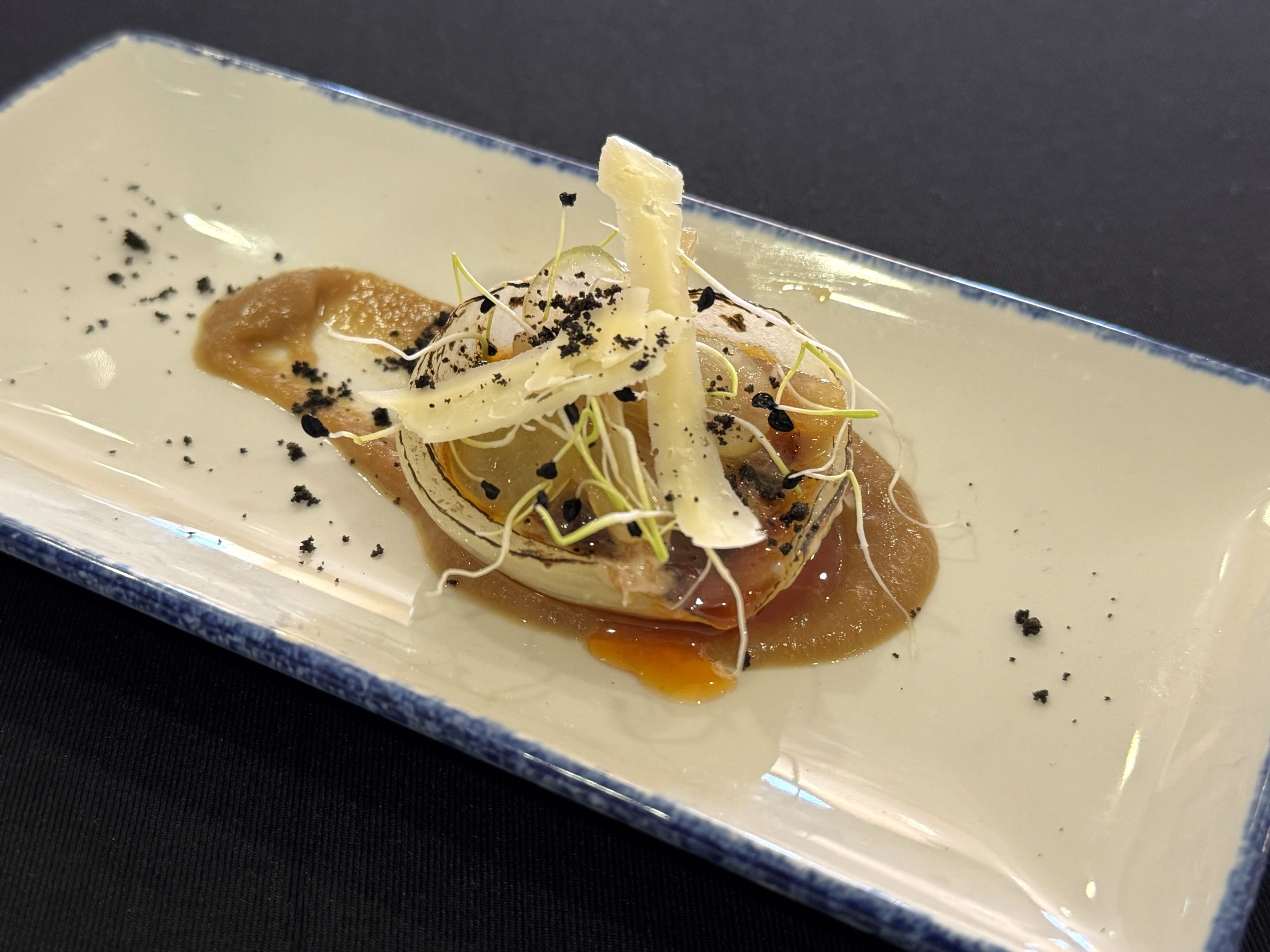 Empanada de cochinillo al horno de leña con cebolla caramelizada en vermut y queso fresco San Antonio. Servida con una criolla de níspero en almíbar de callosa.