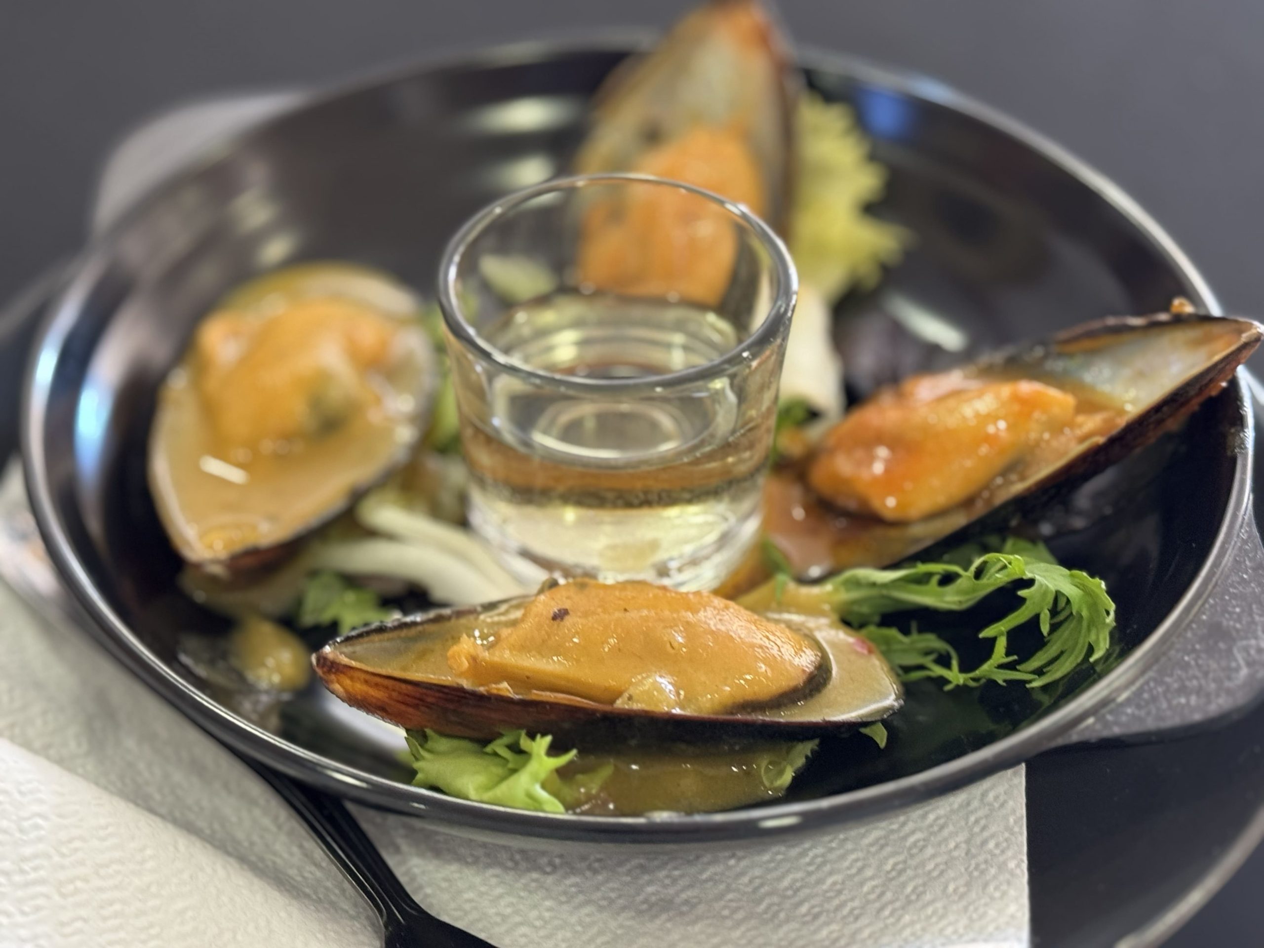 Mejillones en dos salsas bandera española roja de sésamo y amarilla de ahí amarillo.