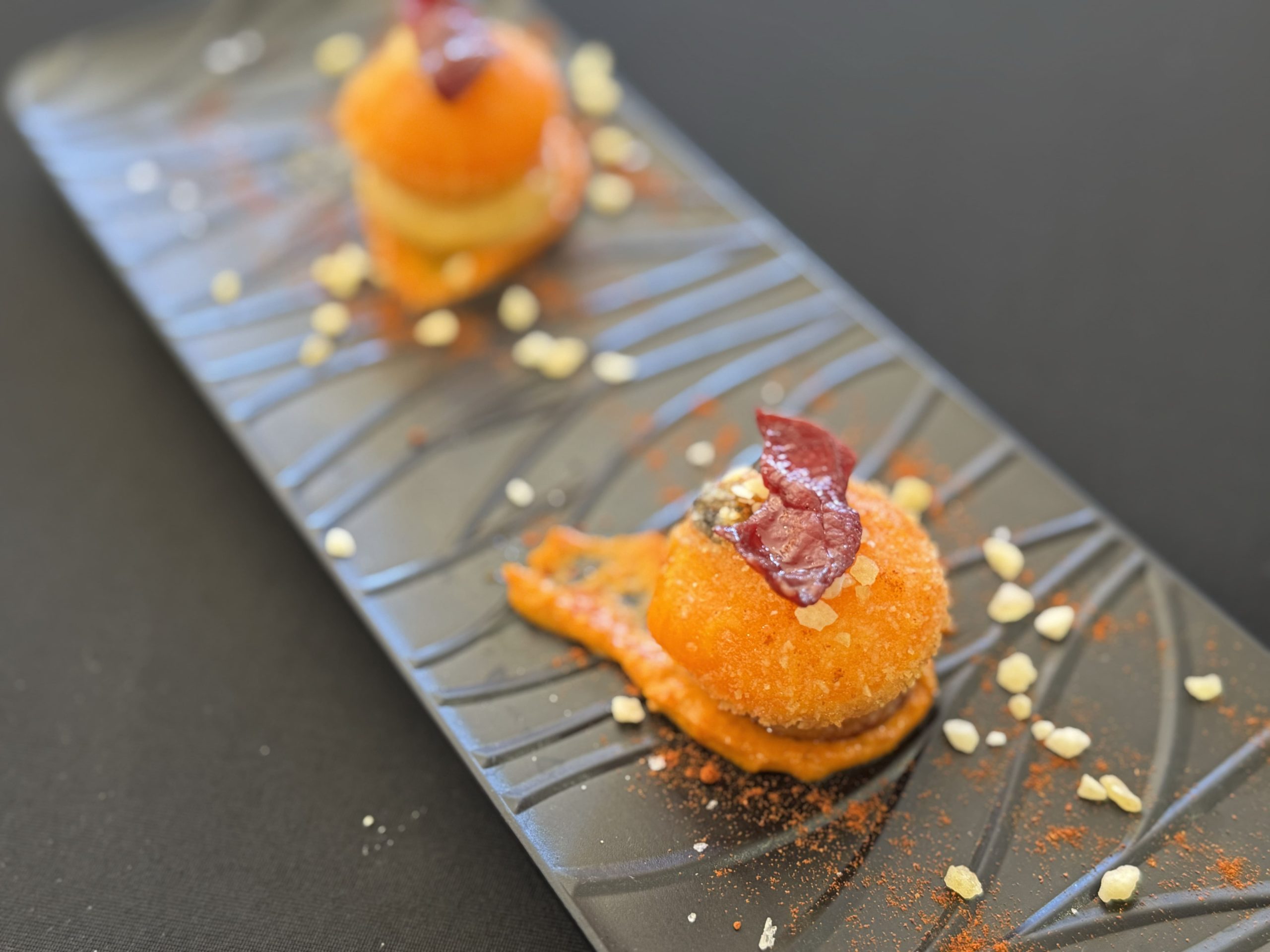 Versión reducida del clásico plato “Huevos Rotos”: Base de patata con salsa romesco, seguido de yema de huevo trufada y empanada y coronada con crujiente de cecina y petazeta.